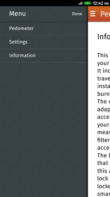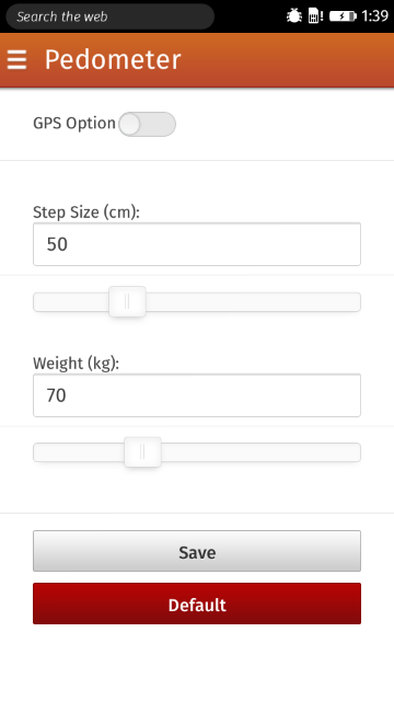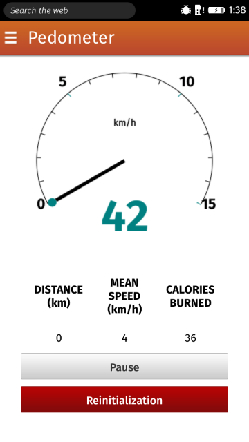 Pedometer for Firefox OS This web-app is available in english and in french. It is partially translated in spanish ------ This pedometer counts your steps when you are walking. It indicates you the distance traveled, the mean and instantaneous speed and calories burned. The calculation is based on an adaptive thresholding of accelerometer data measured by your smartphone. To minimize measurement errors, a Kalman filter can correct the measured accelerations and the accelerometer can be checked bby GPS data. The lock screen must not start so that the web-app works. After you can put your smartphone in your pocket and walk freely. After your hike, it will do just read your statistics.