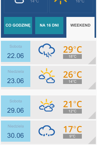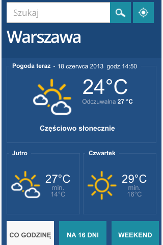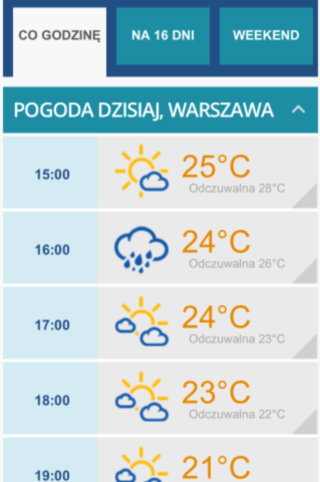 Aplikacja Pogoda to prognoza pogody od INTERIA.PL. W aplikacji znajdują się: prognoza pogody na 16 dni, szczegółowa prognoza pogody na najbliższe 72 godziny. Prognoza pogody jest aktualizowana co 60 minut. W aplikacji Pogoda znajdziesz Pogodę dla Twojego miasta, 42.000 miejsc w Polsce i 80.000 na całym świecie.