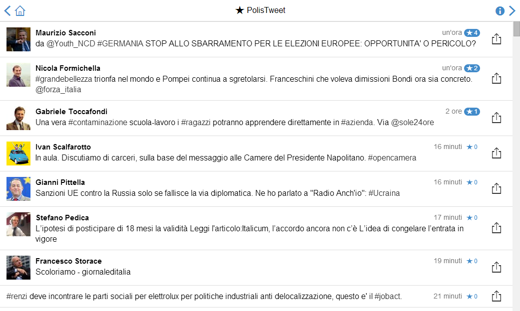 PolisTweet, i cinguettii recenti dei politici italiani più in vista Leggi i tweet dei big della politica anche senza essere iscritto a Twitter. Tutti i messaggi più recenti e un focus sui più popolari, aggiornato in tempo reale. Tocca un tweet per condividerlo, tocca un politico per leggere i suoi tweet migliori. Link e retweet sono automaticamente esclusi per dare maggiore enfasi alle parole e le immagini. Per ogni politico viene segnalata l'influenza attuale su Twitter, pari al gradimento dei suoi ultimi messaggi. Segui le comunicazioni di oltre 200 esponenti dei principali partiti politici di ogni schieramento: Partito Democratico (PD), Movimento 5 Stelle (M5S) Forza Italia (FI), Nuovo Centrodestra (NCD), Scelta Civica, Lega Nord, Sinistra Ecologia Libertà (SEL), Fratelli d'Italia, Centro Democratico (CD), Unione di Centro (UdC) e altri.