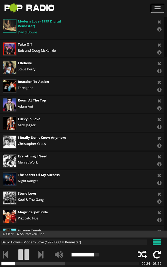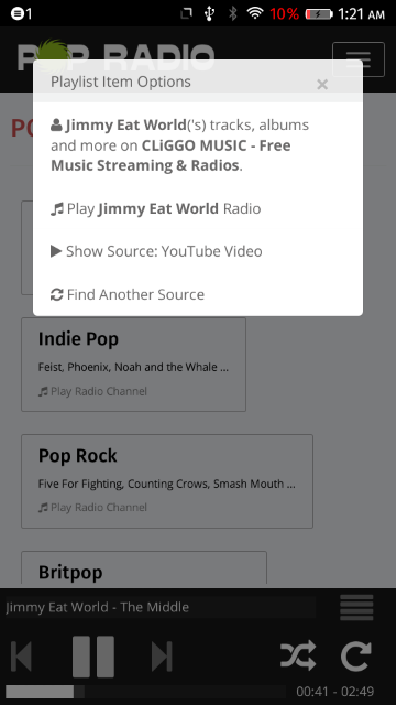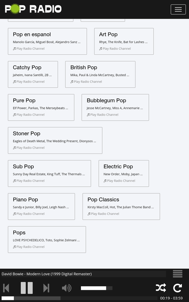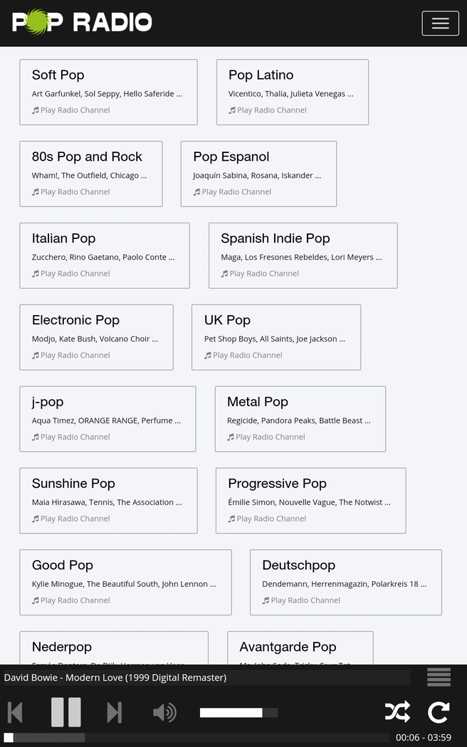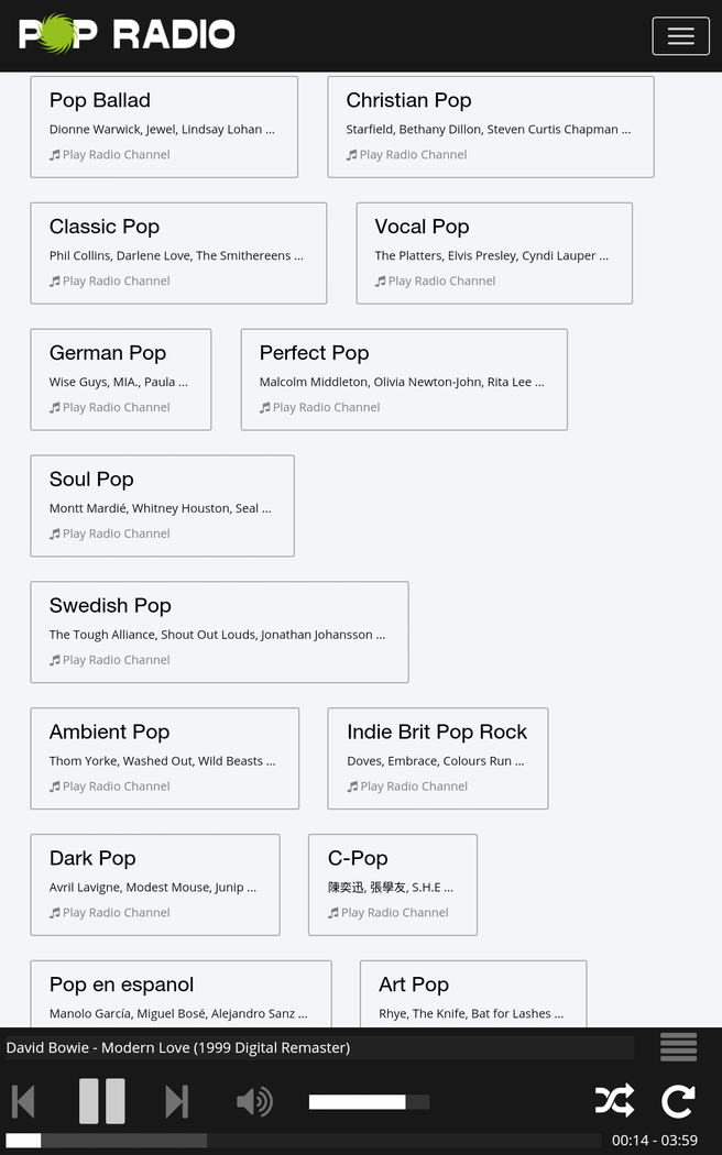 Pop Music Radio offers 80+ radio stations with the best pop music of all genres. You can play and enjoy music from your smartphone, tablet or PC at any time, anywhere in the world. More information about titles and artists is shown while your music is playing. Furthermore, you can see the entire playlist, directly select individual songs and jump forward and backward in the list. If you have a particularly liking for an artist that was just played, you can compile an individual artist radio with just one click. The Radio App is free of charge and offers the following options: • 80+ different music channels • Music channel playlists with additional information about the songs and bands • A radio station can be generated for each and every artist • No advertising interruptions • Intuitive and easy to use • Access to the CLiGGO MUSIC database with over 30 million titles • Play music in the background and when the display is off • Connection to CLiGGO MUSIC to view profiles of bands and artists and other tracks, albums, concerts, personal playlists and much more • The application is constantly being developed further and musically expanded and improved Choose from 80+ music channels and genres, such as: • Pop • Indie Pop • Pop Rock • Britpop • Synthpop • Electropop • Pop Punk • Power Pop • Dream Pop • Latin Pop • Dance Pop • Alternative Pop • Electro Pop • 80s Pop • 90s Pop • 00s Pop • 70s Pop • 60s Pop • Pop Life • Teen Pop • Europop • French Pop • Spanish Pop • Country Pop • Pop Music • Chamber Pop • Noise Pop • Lollipop • Fave Indie Pop • General Pop • Psychedelic Pop • Jangle Pop • Folk Pop • Baroque Pop • Twee Pop • Poppy • Soft Pop • Pop Latino • 80s Pop and Rock • Pop Espanol • Italian Pop • Spanish Indie Pop • Electronic Pop • UK Pop • j-pop • Metal Pop • Sunshine Pop • Progressive Pop • Good Pop • Deutschpop • Nederpop • Avantgarde Pop • Pop Ballad • Christian Pop • Classic Pop • Vocal Pop • German Pop • Perfect Pop • Soul Pop • Swedish Pop • Ambient Pop • Indie Brit Pop Rock • Dark Pop • Pop en espanol • Art Pop • Catchy Pop • British Pop • Pure Pop • Bubblegum Pop • Stoner Pop • Sub Pop • Electric Pop • Piano Pop • Pop Classics Enjoy the best artists and bands: • Phoenix • Amy Winehouse • Lady Gaga • Feist • Five For Fighting • Smash Mouth • Supergrass • Razorlight • Robbie Williams • Erasure • College • Miike Snow • Britney Spears • Goldfinger • blink-182 • Weezer • The xx • Juanes • Jennifer Lopez • Pixie Lott • Kylie Minogue • Broken Bells • Simply Red • Madonna • Aqua • Maxwell • Amy Grant • Lee Ann Womack • Tom Jones • Cat Stevens • The Beatles • Simon & Garfunkel • James Taylor • Eric Clapton • Miley Cyrus • Jacqueline Taïeb • Ricardo Arjona • La Quinta Estación • Sara Evans • Carrie Underwood • Train • Timbaland • Goldfrapp • St. Vincent • Pixies • Best Coast • Foxy Brown • Mika • Neon Indian • Nelly Furtado • Morcheeba • The Smiths • Hilary Duff • Florence + the Machine • Milo Greene • Vicentico • Thalía • Wham! • The Outfield • Chicago • Joaquín Sabina • Rosana • Zucchero • Lori Meyers • Modjo • Kate Bush • Pet Shop Boys • All Saints • Joe Jackson • Aqua Timez • Regicide • Tennis • Émilie Simon • John Lennon • Polarkreis 18 • Tricky • Dionne Warwick • Jewel • Lindsay Lohan • Starfield • Phil Collins • The Platters • Elvis Presley • Cyndi Lauper • Wise Guys • MIA. • Paula • Whitney Houston • Seal • Washed Out • Wild Beasts • Embrace • Avril Lavigne • Modest Mouse • 陳奕迅 • 張學友 • Manolo García • Miguel Bosé • Rhye • The Knife • Bat for Lashes • Jaheim • 2B • Busted • Parkas • Jesse McCartney • Annemarie • Eagles of Death Metal • Dionysos • King Tuff • The Thermals • New Order • Moby • Billy Joel • Leigh Nash • Kirsty MacColl • Toto Other: • Click +1 on Google Plus: https://plus.google.com/118148731173422897561 • Click "Like" on Facebook: https://www.facebook.com/CliggoMusic • Follow us on Twitter: https://twitter.com/CliggoMusic • Visit CLiGGO MUSIC for more information and apps: https://music.cliggo.com