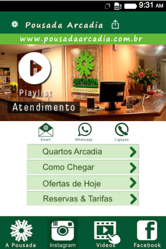 Em pleno coração de Itaipava, região serrana do Rio de Janeiro, a POUSADA ARCÁDIA enquadra-se no conceito de "pousada urbana", unindo todo conforto, charme e requinte de uma típica pousada no campo, com as comodidades e facilidades encontradas nos centros urbanos. Em um só lugar - ARCÁDIA MALL - estão reunidos, Pousada, Centro de Convenções, Lojas com mix variado, Centro Médico e Serviços e Espaço Cultural. Desfrutando de um dos melhores climas do mundo, Itaipava possui o renomado título de "Vale dos Gourmets", e oferece excelentes oportunidades para a prática de inúmeras opções de lazer. Agora todas as nossas informações estarão disponível através do nosso aplicativo. - Faça reservas; - Escute som ambiente; - Entre em contato pelo WhatsApp; - Galeria de Fotos; - Galeria de Vídeos; - Acesse nossas redes sociais; - Veja as ofertas do dia. O app funciona offline também com restrição de recursos que exijam a conexão Wifi ou 3G/4G. Desfrutando de um dos melhores climas do mundo, Itaipava possui o renomado título de "Vale dos Gourmets", e oferece excelentes oportunidades para a prática de inúmeras opções de lazer.