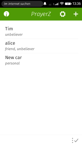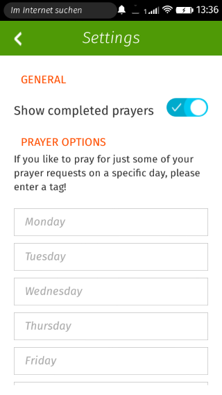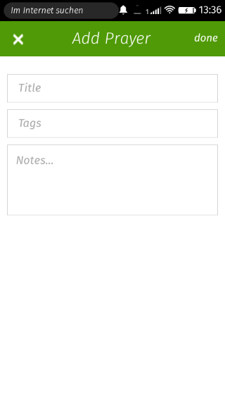 Organize your prayer requests! This app helps you to add prayer requests or praise reports and organize them with tags. You can set specific tags for a week day, so only prayers with this tag will be shown.