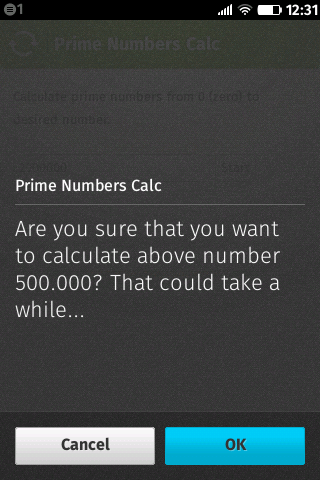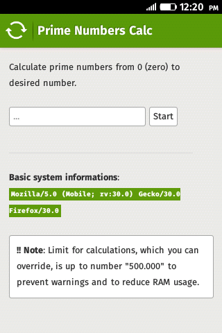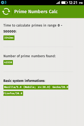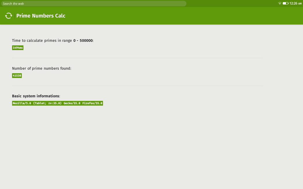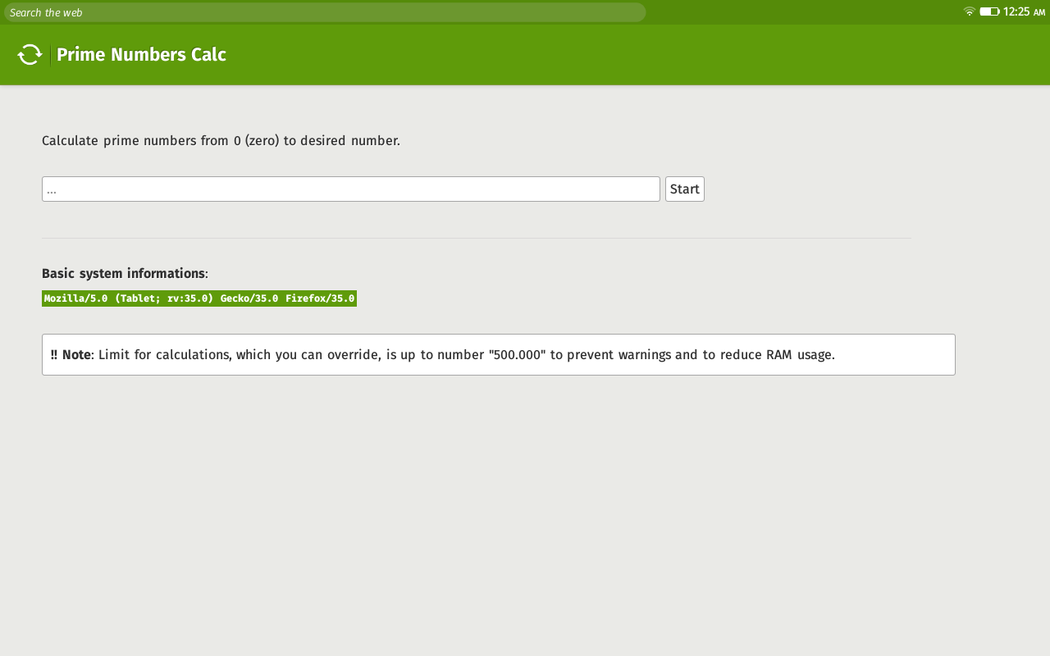 This application can be used as a simple benchmark to test the speed of your device by taking into account the time spent on calculating prime numbers in a range that the user defines. The computation time of primes in a given range can serve as a rough indicator of the speed of your device. !! Note: Limit for calculations is up to number "500.000". This is set to prevent "Unresponsive script" warning on Firefox OS v1.1.x. It is also a sane limit for devices with low RAM memory. For numbers above it, user must confirm. References: http://stackoverflow.com/a/12287599 (JS prime numbers implementtion).
