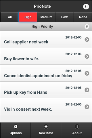 Prio Note - Priority for your notes. Categories your notes with priorities from none to high. Categories your notes with priorities: none, low, medium and high. Total number of notes is shown in right upper corner and list with all notes is available as well. Sort your notes in alphabetic order or by date.