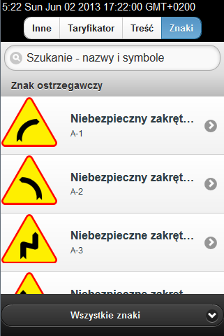 Application in the Polish language only with information about law regulations related to the road traffic in the Poland and other useful information for drivers. Kodeks Drogowy i Ustawa o kierujących pojazdami (po 19.1.2013), Taryfikator mandatów i punktów, symbole i opisy znaków drogowych, informacje o alkoholu, prędkości, pomiarach prędkości i inne przydatne opisy dla polskich kierowców. Aplikacja w wersji beta, obecnie w aplikacji zawarte są: 1. Kodeks Drogowy (Prawo o ruchu drogowym) ze zmianami po 19.1.2013 2. Ustawa o kierujących pojazdami ze zmianami po 19.1.2013 3. CAŁY Taryfikator mandatów (tabela B i C) i punktów karnych wraz z kodami czynów (oddzielne i połączone) z uwzględnieniem zmian z czerwca 2012 4. znaki drogowe - informacje opracowane na podstawie Rozporządzeń 5. Rozporządzenie w sprawie postępowania z kierowcami naruszającymi przepisy ruchu drogowego 6. prędkość - informacje o maksymalnej prędkości i sposobach jej pomiarów 7. towary niebezpieczne - informacje o towarach niebezpiecznych opracowane na podstawie Umowy europejskiej dotyczącej międzynarodowego przewozu drogowego towarów niebezpiecznych (ADR), jak również kody UN różnych towarów 8. numery alarmowe 9. informacje o oznaczeniach opon 10. oznaczenia olejów silnikowych 11. szczegóły prawne dotyczące stanu po użyciu alkoholu i stanu nietrzeźwości 12. informacje o kodach ograniczeń w prawie jazdy i inne