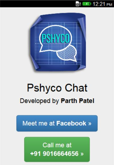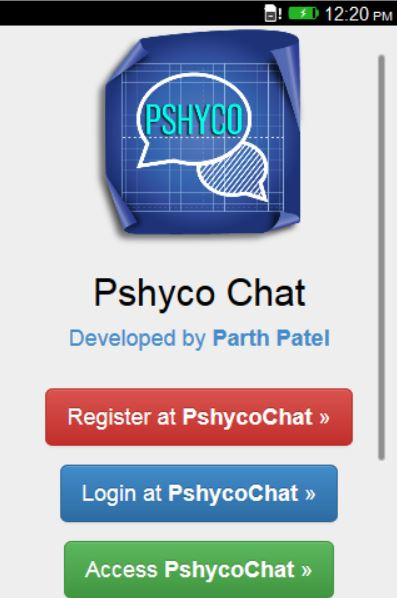 Pshyco Chat -> Pshyco Chat will connect you to the world. -> Easy to Use WebApp for Firefox Devices. -> Simple and Quick Loading Interface. -> Responsive Design. -> User Friendly Interface. ===> App is Developed by Parth Patel (Pshyco Technology, India)