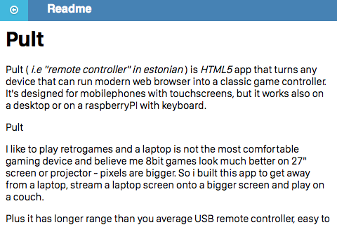 Pult turns your FirefoxOS phone into wireless game controller. It's the first ever gamepad that uses only open web technologies and it's opensource, so all curious minded people can help make it even better. Pult has many unique features: