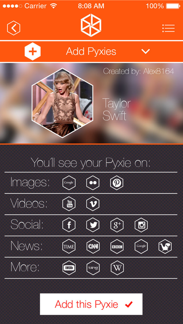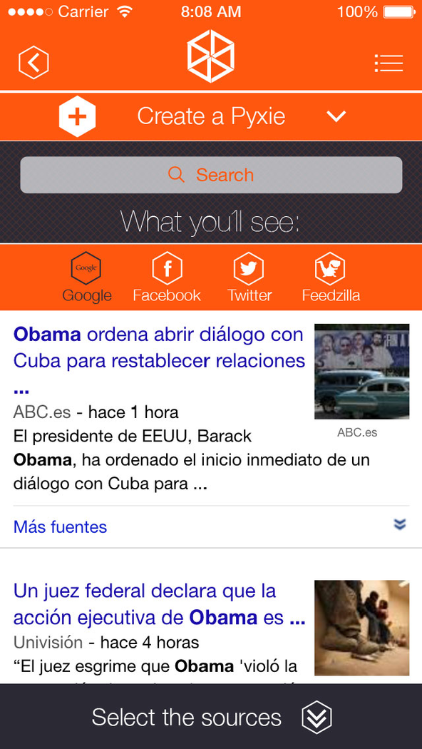 Pyxies let you create and share your own content from a specific search term! Create a tag and select the sources you want, Pyxies will show to you the earliest serch results. A Pyxie for each topic or term you want will be created so you can check the latest news or what social networks are talking about.