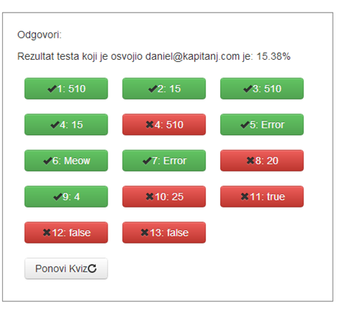 Quiz App za Firefox izazov Aplikacija je zabavnog i edukativnog karaktera. Predefinisana su pitanja i korisnik odgovara na ista. Skinite i testirajte svoje znanje iz JavaScripta! U planu je redizajn aplikacije.
