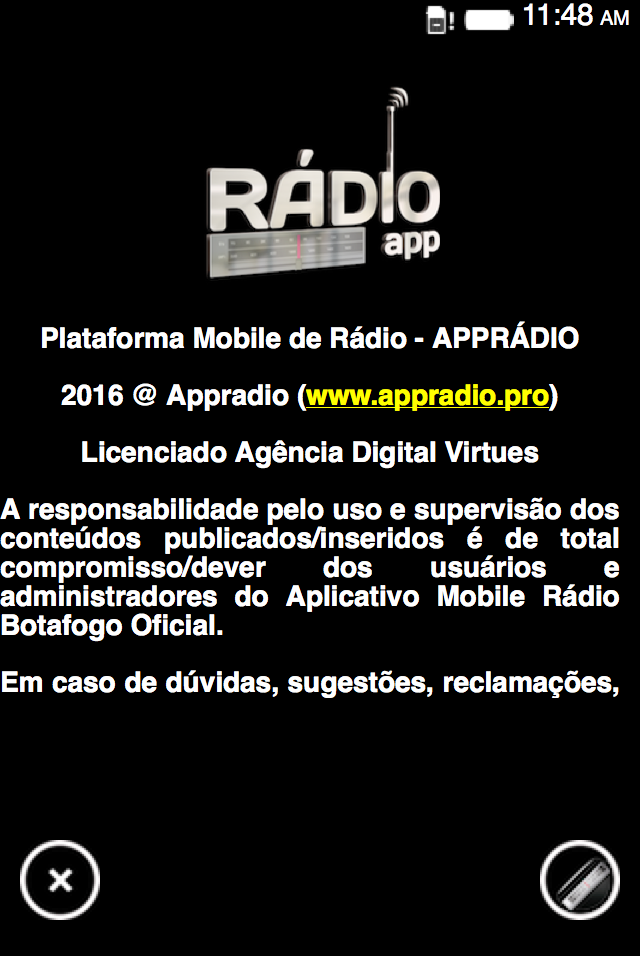Nosso campeão desde 1910 chega oficialmente a plataforma Firefox OS. Escute a rádio oficial do Botafogo através do seu iPhone, iPod, iPad e pelo sistema CarPlay incluso em alguns carros. Interaja através das nossas redes sociais e do WhatsApp, mande-nos email através da tela de contato do aplicativo. Escute nossa rádio dentro do estádio através do seu iPhone, iPod ou iPad. Não perca tempo, baixe agora mesmo e fique mais próximo do seu time do coração.