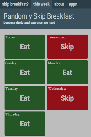 Diets and exercise are hard. Try something easier. Try skipping breakfast on two (random) days each week. The easiest form of intermittent fasting: just skip breakfast two (random) days each week. Use the App to find out each morning if you get to eat breakfast (or to plan your week).