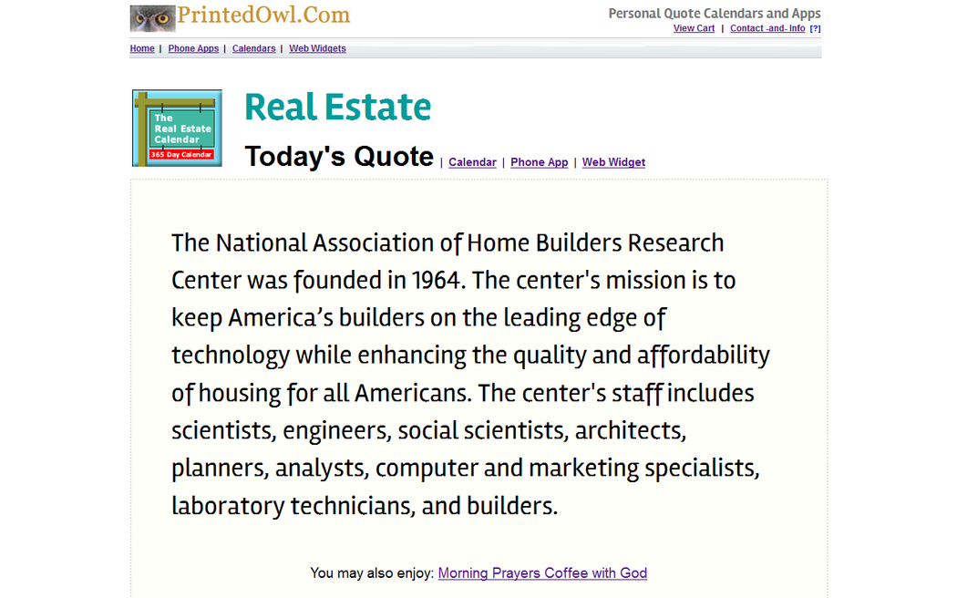 Real estate facts, terms, people, websites, history, and events. Each day presents an interesting reference devoted to the real estate and housing industries. Practical, informative and entertaining.