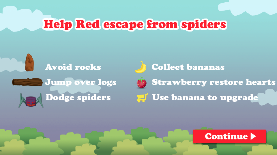 Run, Red! The spiders are coming! Help Red escape his pursuers in this fast-paced endless runner game. He'll only survive by dodging rocks and logs and collecting valuable bananas and strawberries!
