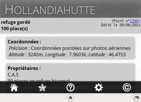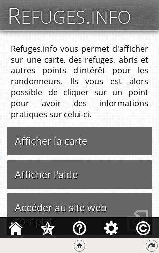 Cette application affiche des informations sur les refuges, cabanes et abris de montagne sur une carte OpenStreetMap. Toutes les données sont tirées du site collaboratif refuges.info, cette application est spécialement conçue pour les randonneurs d'Europe et des pays francophones. Licence : CC By-Sa 2.0