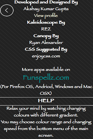 Enjoy three different ways to relax yourself. 1. Colour Change: Make your eyes relax by watching changing colours on your screen or use it as a night lamp and watch the colours in motion with hundreds of beautiful colours. 2. Kaleidoscope: A truly beautiful patterns as you see from a real Kaleidoscope with splash of colours. 3. Canopy: An amazing endless zooming pattern of growing branches and blooming.