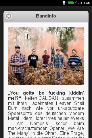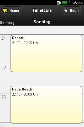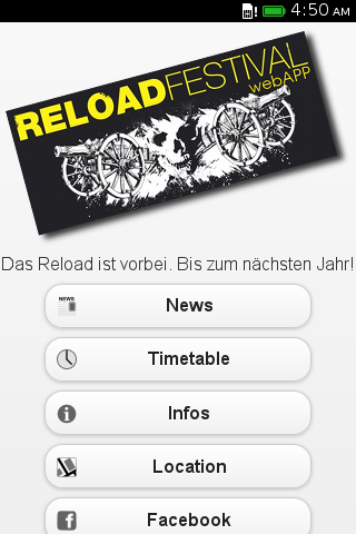Der mobile Festival Guide zum Reload-Festival 2013 im neuen modernen Design! Features: - Komplette Timetable auf deinem Handy - Now/Next Playing - Interaktiver Areaplan - Alle Festival Infos, wie z.B. der Duschen, Essen und Trinken, direkt auf dem Handy - Aktuelle News - Infos zu den Bands abrufen (Band antippen in der Timetable ;) ) - Alle Daten sind auch offline verfügbar!