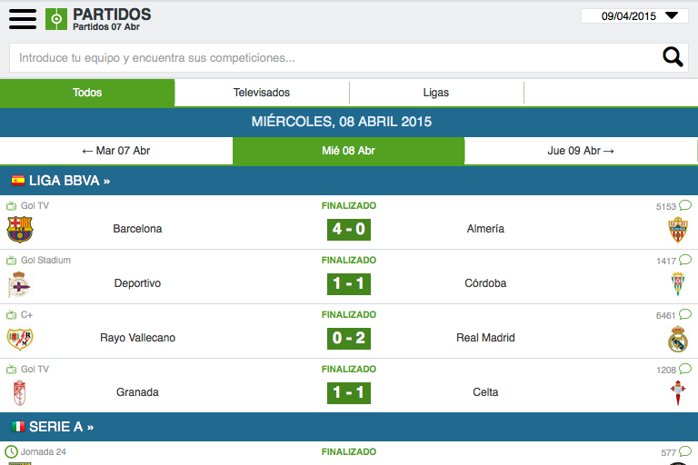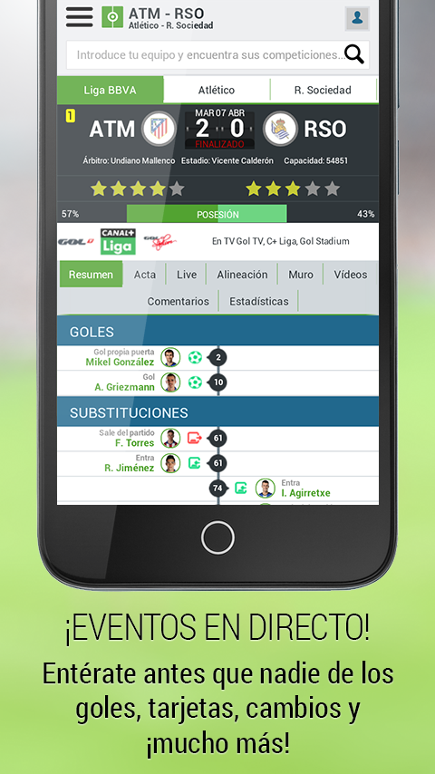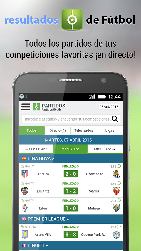 ¡Descárgate la aplicación oficial de resultados de fútbol y vive el deporte rey! En resultados-futbol.com encontrarás todas las ligas de fútbol del mundo, informándote a cada minuto sobre resultados en directo, canales de TV donde retransmitirán los partidos televisados, eventos y mucho más... CARACTERÍSTICAS: - Los partidos del día (Ayer, Hoy y Mañana) - Livescore, el estado de todos los partidos del día en directo - Noticias - Fichajes y rumores - Busca en competiciones tu liga favorita - Todas los calendarios de las competiciones y sus estadísticas (goleadores, los más amonestados, asistencias, etc) - Clasificaciones de todas las ligas - Estadísticas y pronóstico de los partidos - Alineación de los equipos - Histórico de partidos - Comentarios de partidos y noticias - Todas las ligas internacionales: Champions, Europe League, Mundial, Premier, Serie A, Ligue 1, Bundesliga, Segunda, Tercera, etc. ¡Gratis!