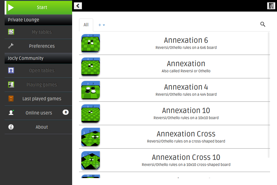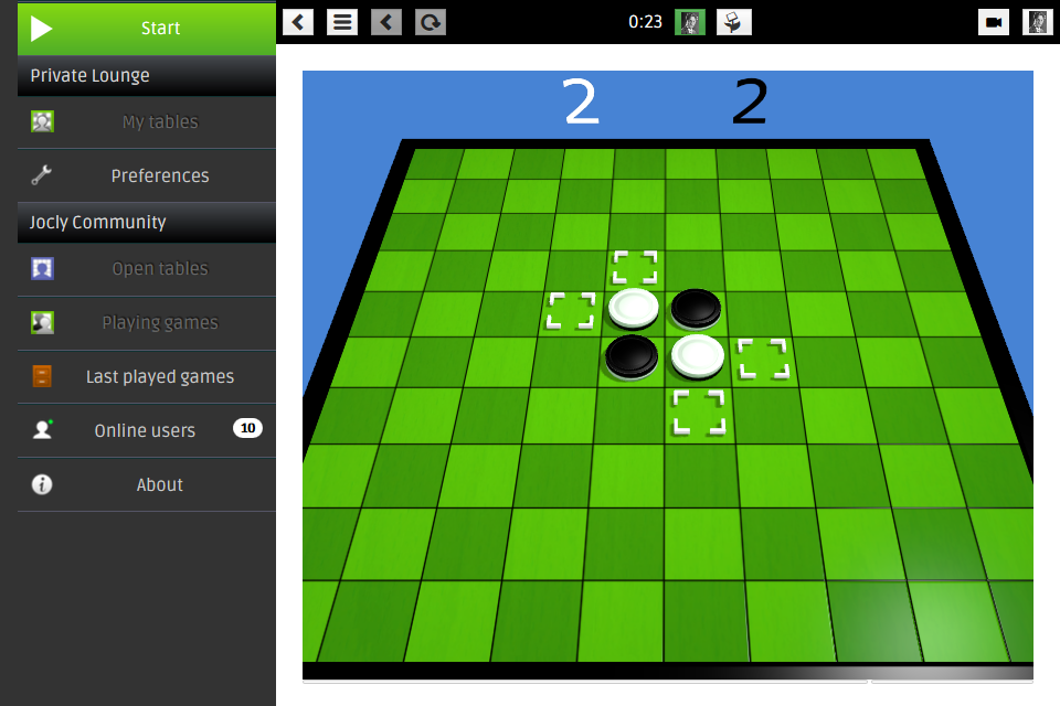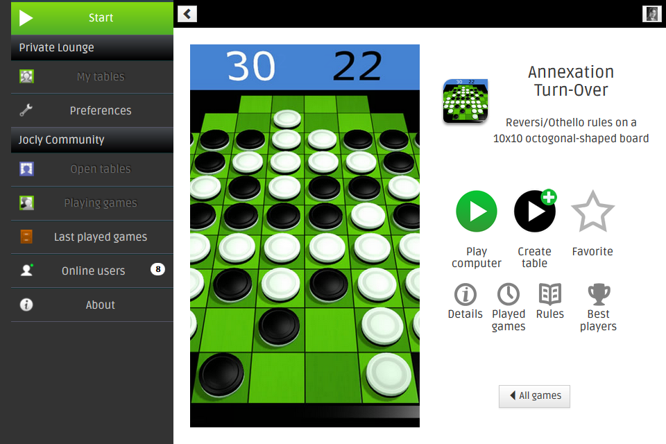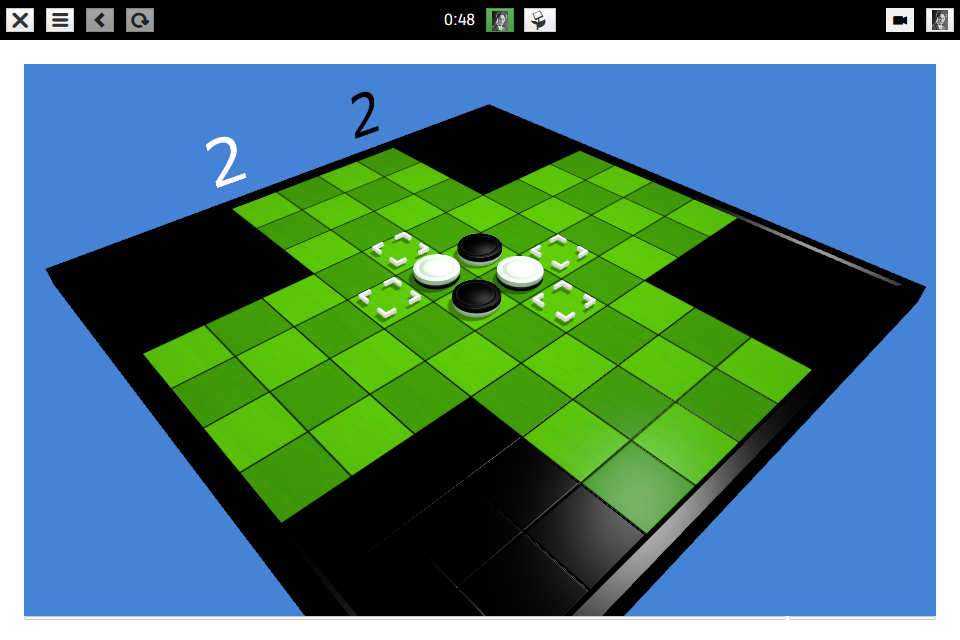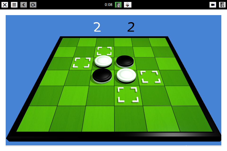 Reversi is a turn-based strategy game invented at the end of the 19th century. Two players called Dark (black) and Light (white). Each player puts one piece per turn on the board. The piece must be put on a space so that it sandwiches one or more of the opponent's lines (diagonal or vertical). The sandwiched disks are flipped to the color of the current player. If a player can not play, he must pass his turn. The classic board is a 8x8 grid. The application includes variants with different board sizes and shapes.