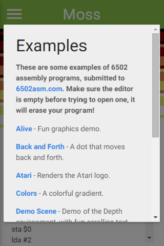 Moss is an assembly code compiler for the 6502 CPU. The 6502 CPU was introduced in 1975 as a super cheap processor for consumer electronics. It was a smash hit, and powered millions of devices including the Apple II, Commodore 64, and Nintendo Entertainment System. It was developed by MOS Technology, and that's where the name comes from. Features: