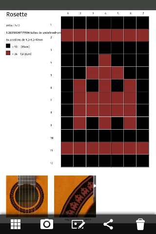 A tool for helping instrument maker in guitare rosettes design. Features : * Draw rosette with touchscreen * Multi colors * png synthesis export to sdcard/gallery * zip export with multi format to sdcard * GPL Licence Roadmap for v2 : * export to *.gr for Guitare Rosace compatibiliy (see http://www.gillesmaire.com/tiki-index.php?page=Rosace+Guitare ) * send rosette by e-mail * store differents rosettes