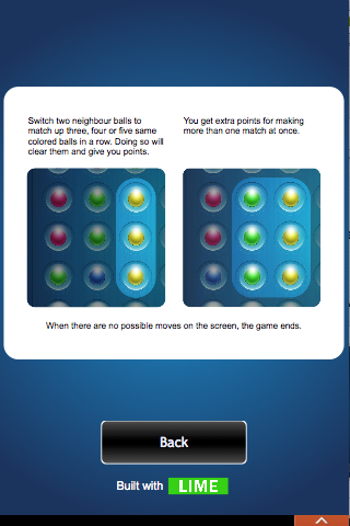 Mude duas bolas vizinhas para igualar-se três, quatro ou cinco bolas coloridas na mesma fileira. Se o fizer, vai limpá-las e dará pontos.