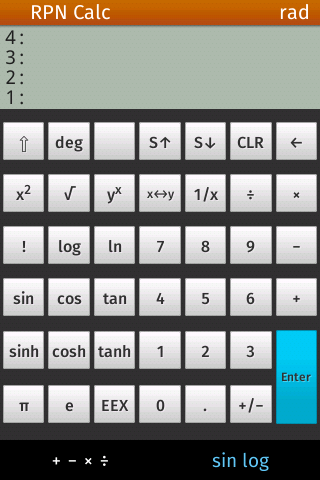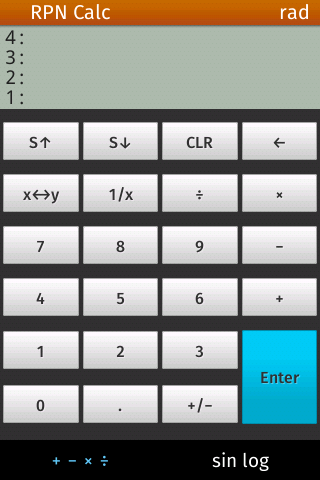 A scientific RPN calculator. RPN (Reverse Polish Notation) is a mathematical notation in which every operator follows all of its operands. It's notably used in the famous HP-48 calculator.