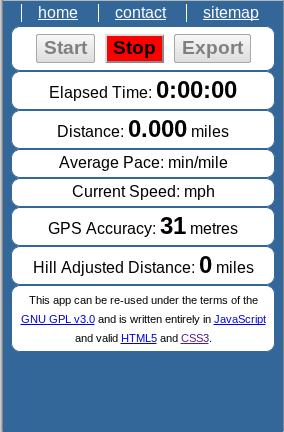 A GPS based app, which will display time, distance and pace while running and output the track as gpx. The app uses your GPS to record each change of position on your device. It updates your elapsed time, distance, average pace and current speed at each change in position. When you stop recording, you can export the track as GPX data. The app is set to record only when the accuracy of the GPS reading is 12 metres or better and will record a GPX point every 5 seconds.