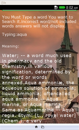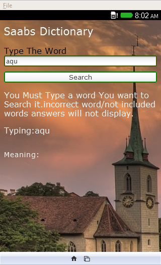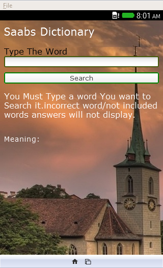 My first Dictionary This is My first App.and this is in Beta Mode.Updates will come soon Note: Incorrect word,Word not include in our list will not display the meaning. Next-Updates Includes: . Auto Correction . Word Suggestion . Improved UI . etc Please give the Review for this app. my email: [email protected]