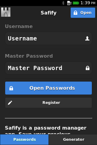 Safify is a password manager. This password safe saves your passwords in a secure way so that they can be accessed from every device online . Generate new secure passwords with the password generator. All your data is encrypted directly on your device and your master password too. We only get your encrypted data. Try it at safify.tk !