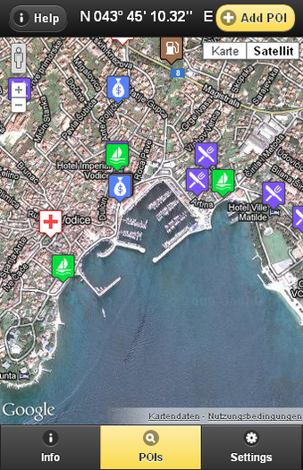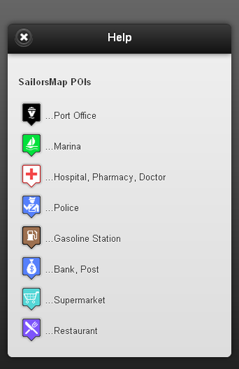 SailorsMap provides localized Nautical Information necessary for cruising at sea. The provided information is found via Google Maps Search. If your device supports GPS you can switch on Location Awareness to see your current position.