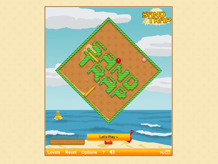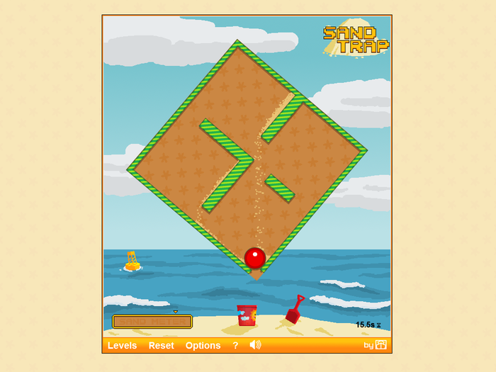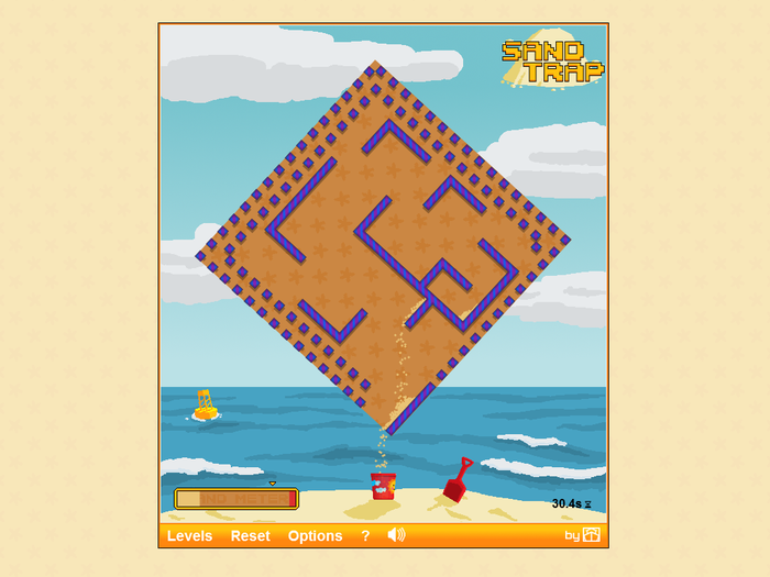 Pour the sand into the pail. Sand Trap by Gopherwood Studios is a puzzle game challenging you to remove the sand from the rotating labyrinth and pour it into the sand pail. Drag the labyrinth with your mouse to rotate or use the arrow keys for more precise control. Sand Trap offers 20 levels of mazes and obstacles to navigate through. Replay levels to improve on your best times or reset the game to retry from the beginning. Enjoy!