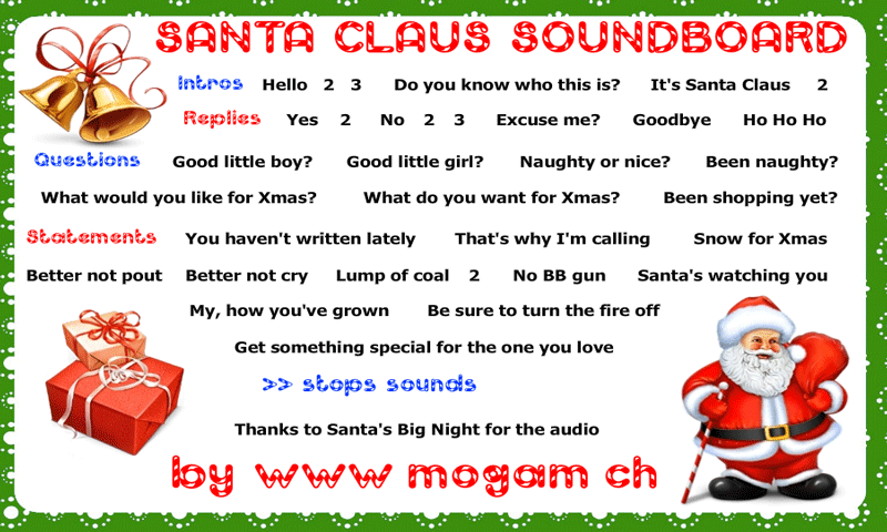 Santa Claus Soundboard Santa needs to know what you want, and if you have been naughty or nice. Santa Claus with over 30 phrases voices sounds and more. Html5 web app audio
