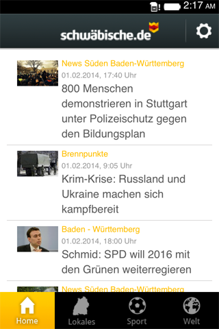 Schwäbische.de: Nah dran ACHTUNG: Nachdem Schwäbische.de am 5.5. einen Relaunch vollzogen hat, sind zur Zeit keine Nachrichten mehr in der App verfügbar. Die App wird sobald wieder RSS Feeds von Schwäbische.de verfügbar sind, auf diese Umgestellt. Solange empfehle ich http://m.schwaebische.de zu nutzen. Machen Sie Ihr Smartphone zum Newsdesk, mit Nachrichten der Schwäbischen Zeitung. Schwäbische.de bringt Sie immer und überall ganz nah ran an die Region - und das völlig kostenlos: Wir liefern Ihnen die neuesten Nachrichten aus Ihrer Umgebung und berichten aktuell vom Geschehen in Deutschland und der Welt. Alles, was den Süden bewegt lesen Sie bei schwäbische.de - ganz leicht zu finden durch die eigens für Firefox-Smartphones gestaltete Navigation. Noch näher ran Mit dieser App kommen die neuesten Nachrichten direkt aus Ihrer Stadt zu ihnen: wählen Sie aus 45 Orten sowie Gesamt-Baden-Württemberg und Bayern Ihre persönliche Zusammenstellung der aktuellen Nachrichten. Viel Freude damit. Diese App wurde mit der offiziellen Erlaubnis der Schwäbischen Zeitung Online Gesellschaft für Multimedia mbH & Co. KG auf Basis der Schwäbische.de App für Android von Matthias Weiß erstellt. Derzeit werden nur Artikel dargestellt. Galerien und Videos folgen.