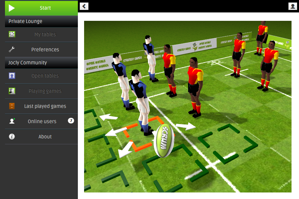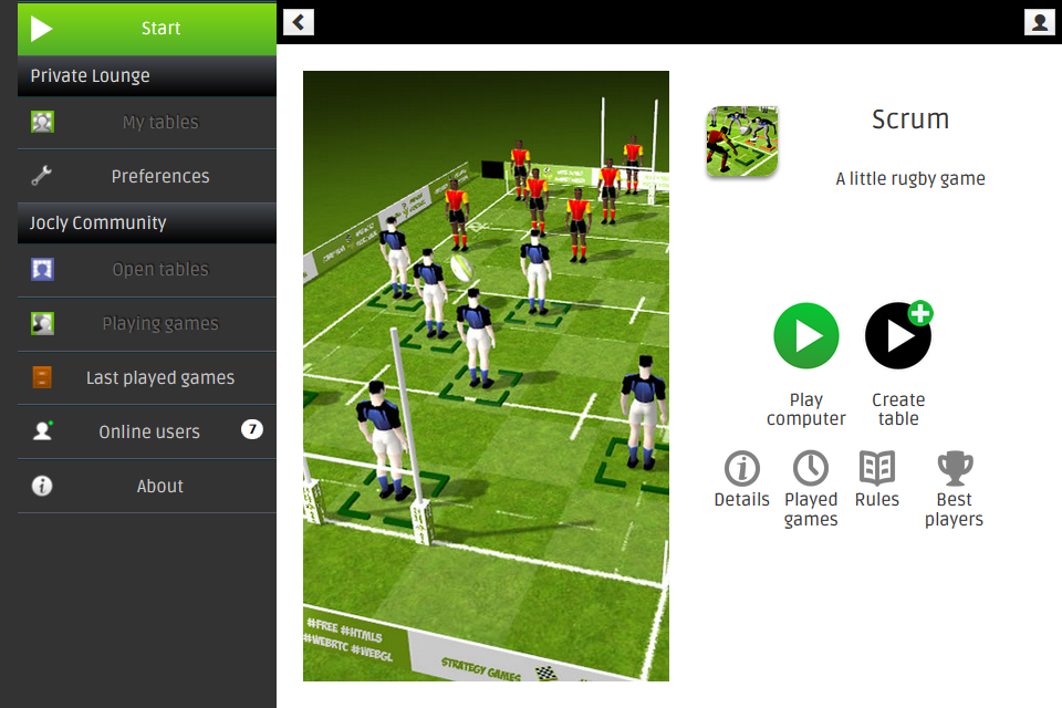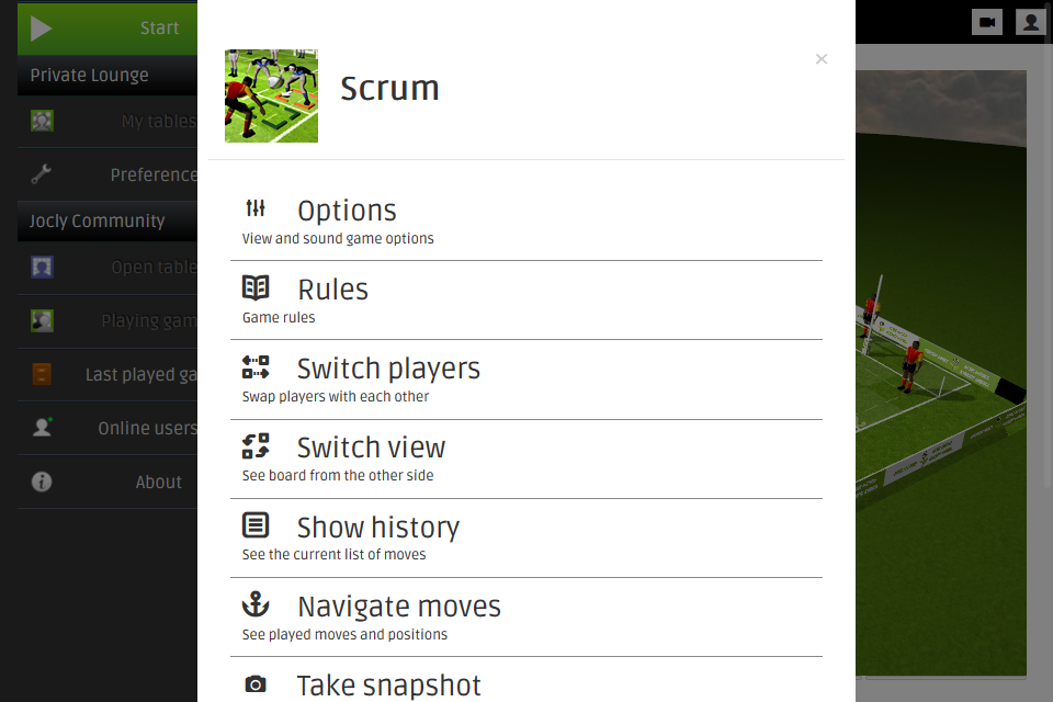A rugby-inspired game Scrum is an abstract strategy game invented in 1981 but never edited, published nor computer implemented. The game is rugby-shaped but does not pretend to mimic the sport rules very closely. The rules can be learned in one minute. The game lasts generally about 5 minutes. A video explaining the rules can be watched at http://www.youtube.com/watch?v=XPgmjhDkvQE