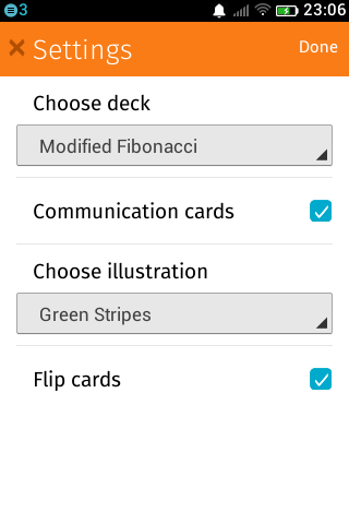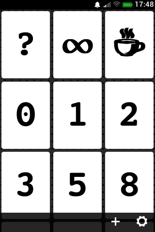 A cheerful deck of Scrum poker cards. Actually, a few popular decks to choose from, and a "+" button to add cards to the chosen deck if you need more. Check "Flip cards" and shake your phone to reveal the front side of each chosen card or uncheck it to show the front side only. Optional "Communication cards".