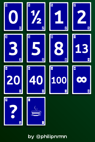 Scrum Poker is an estimation technique commonly used in the Agile software development methodology. This handy app allows you to pick and display story sizes from zero to infinity (or signal that your caffeine levels are dangerously low) without having to carry a pack of cards.