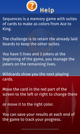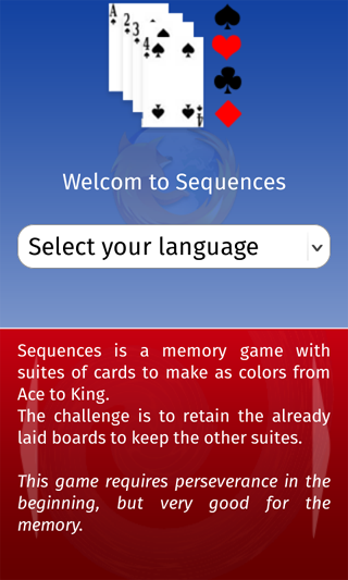 Sequences - It's a memory game with suites of cards to make as colors from Ace to King. The challenge is to retain the already laid boards to keep the other suites. This game requires perseverance in the beginning, but very good for the memory