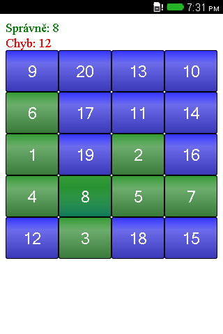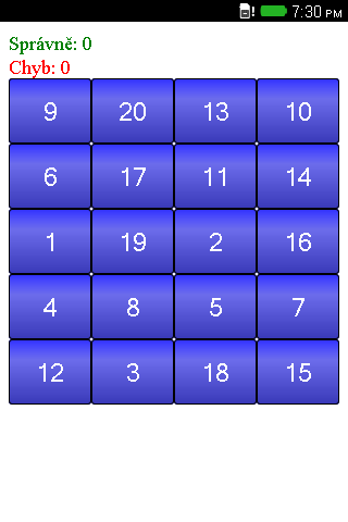 This app automatically generate table with randomly sorted numbers from 1 to 20. Your only task is to click on numbers as their value rises. So start with 1 and finish at number 20. When you click on the correct number will turn green. Conversely, when clicking wrong number is counted mistake. The game ends when all the numbers green. Then you are informed about winning and you can see a number of errors. The game then begins again. Video: http://webmup.com/iHxzd/vid.webm