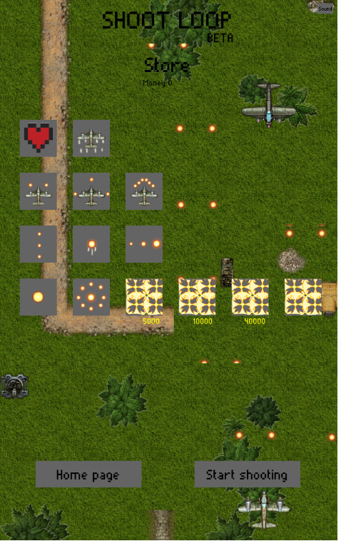 Shoot in loop is a shoot'em up which allow you to fight enemies during infinite battle. Take a plane, customize weapons (gun, power, rate fire, ...), ability of the plane (speed, life, ...) and go shoot them up. Fly farther and farther to get the better score.