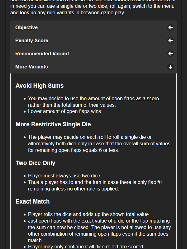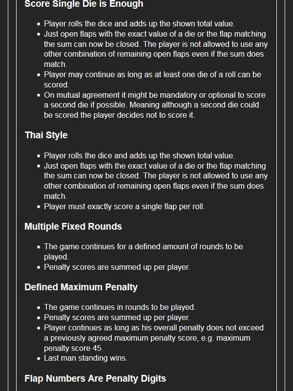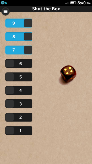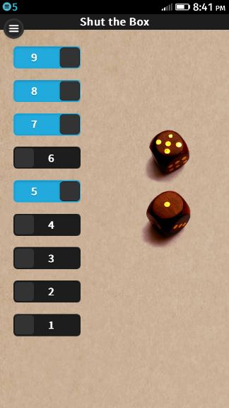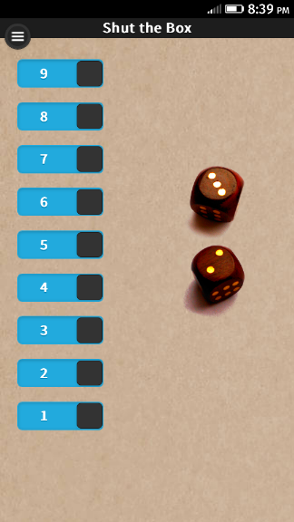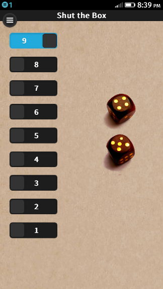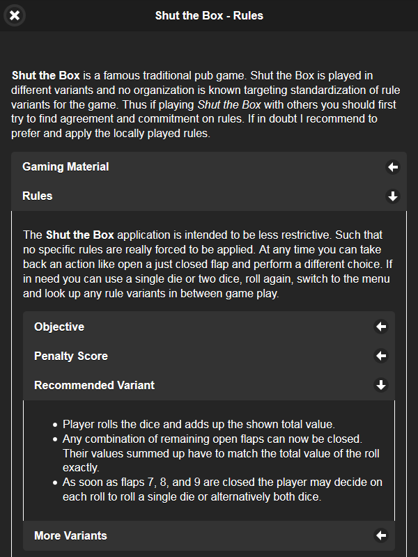 Shut the Box is a famous traditional pub game. Shut the Box is played in different variants and no organization is known targeting standardization of rule variants for the game. Thus if playing Shut the Box with others you should first try to find agreement and commitment on rules. If in doubt I recommend to prefer and apply the locally played rules. Different rules and feature settings available via application menu on upper left.