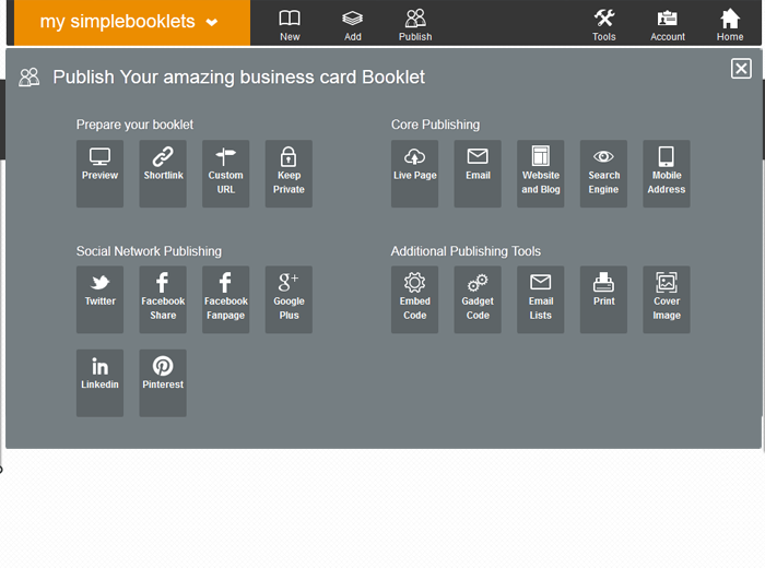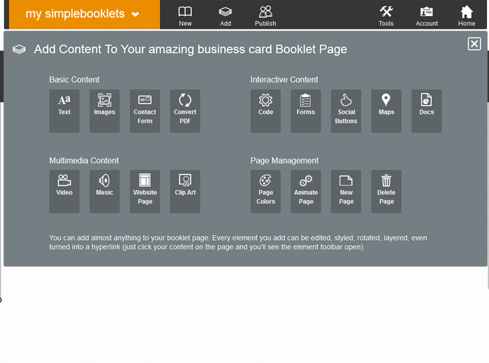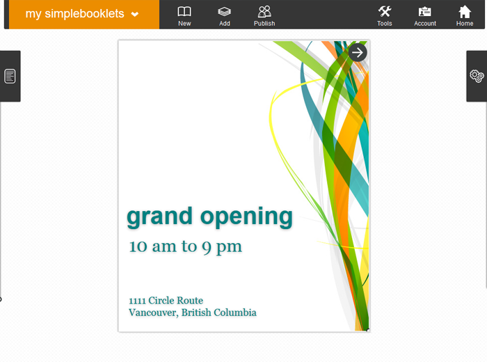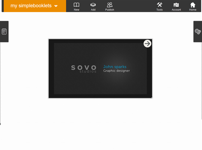 Simple Web Flipbooks and Sliders. Post Everywhere. Create brochures, flyers, sliders and scrollers for the web from scratch or convert existing print marketing collateral into dynamic online flip books. Make your website more compelling, your blog more engaging, your facebook fan page more interesting, and your communications more effective. You can even share your simplebooklet right from it's unique presentation page. Mobile and Tablet ready. Your simplebooklet looks great and flips pages with the swipe of a finger. Now Facebook Fanpage friendly. Add a great looking, fully interactive booklet to your fanpage. Simplebooklet is drag, drop and resize friendly, so you never have to type a single piece of code. Create a custom sized booklet, add any kind of content you like, style it with built in html5 and CSS3 ready tools, and add as many pages as you want. When you're happy with your booklet, share it on your social network using our one-click publishing tools, embed it on your own blog or website, or send it via rich html email to anyone you want. A simplebooklet is a great way to reach out across various digital channels quickly without having to maintain a website or do any coding.