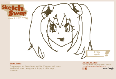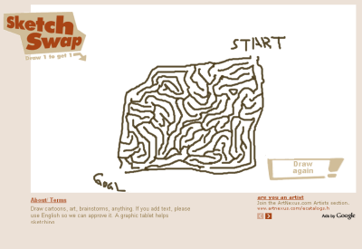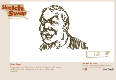 Draw an image... hit the Swap button... then get a random image drawn back to you! Sketch Swap is simple but addictive. On a blank canvas, you sketch something, anything. When finished, hit "Swap"... and after some seconds, a random drawing from someone else will be sketched for you! Note all sketches that will be shown are approved to be family-friendly -- there are over 25,000 approved sketches so far.