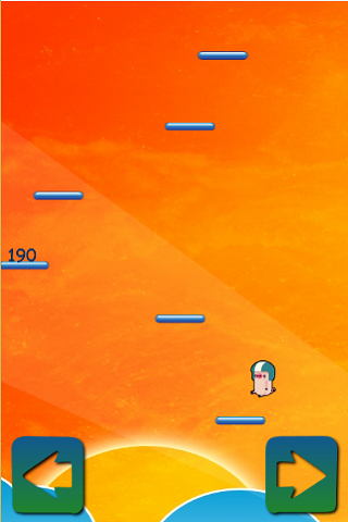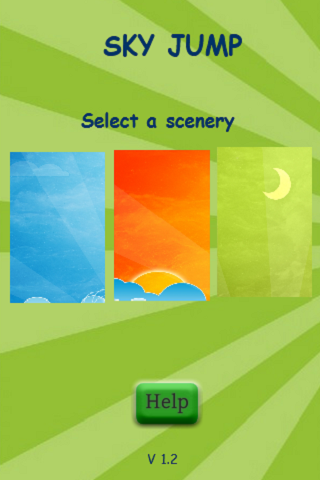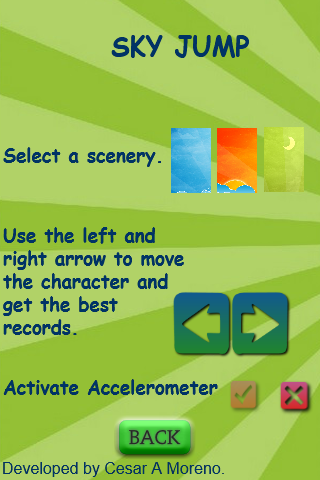 Sky Jump Select a scenery, Use the left and right arrow or activate accelerometer to move the character and get the best records .