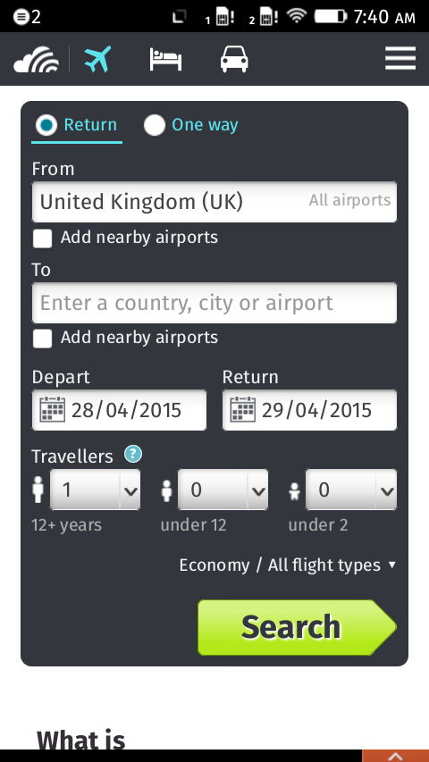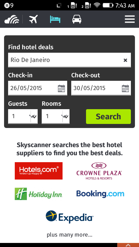 Skyscanner is the world’s travel search engine - the ultimate personal travel assistant for the independent, switched-on traveller. And with sync functionality across mobile, tablet, and desktop, you can plan your trips on the go and pick up where you left off across all your devices Skyscanner flights Search millions of flights from hundreds of airlines in seconds. Find your perfect flight and save money. Get inspired with our search everywhere feature. Skyscanner hotels Compare millions of rooms, read the reviews, find the best location and save it or book it in seconds. It’s a great way to get a great deal on hotels. Skyscanner car hire Find the best deals on wheels by scanning car hire companies around the world. Filter by vehicle type and features to find the right car at the right price. Find out more about Skyscanner here: http://www.skyscanner.net