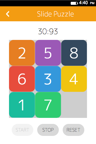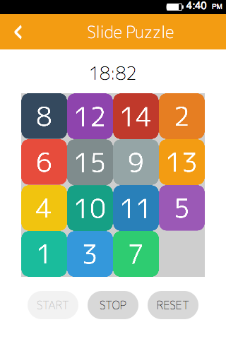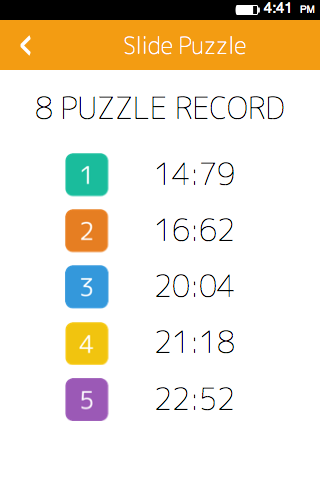 This puzzle is very simple. Choose 8 puzzle or 15 puzzle and start it with "START" button. Then panels are shuffled and you have to return them to their original places by sliding them to the empty place. You can also record clear time and see it with "RECORD" button. Have fun! ------------------------------ 定番でシンプルなスライドパズルです. 3×3のステージに1〜8のパネルが配置された8パズルと,4×4のステージに1〜15のパネルが配置された15パズルがあります.空いているスペースをうまく使って,ばらばらになったパネルを元の状態に戻しましょう. クリア時間は保存されます.自己ベストをどんどん更新していきましょう!
