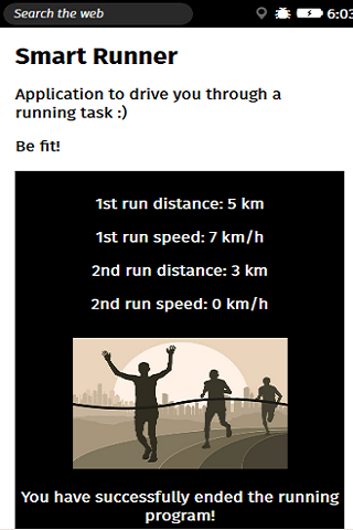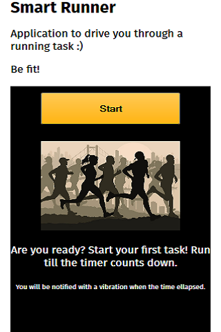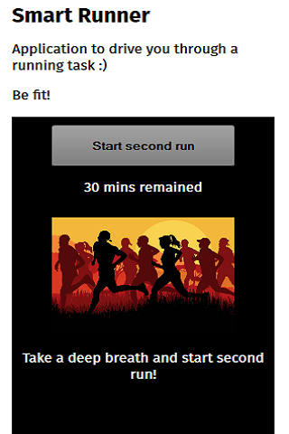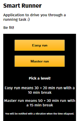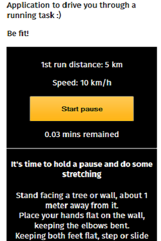Application to drive you through a running exercise. It uses vibration when the time dedicated for a task timed out. Screens also provide a timer to count down the time. At the end of each running task, the application shows your speed and the distance you ran.