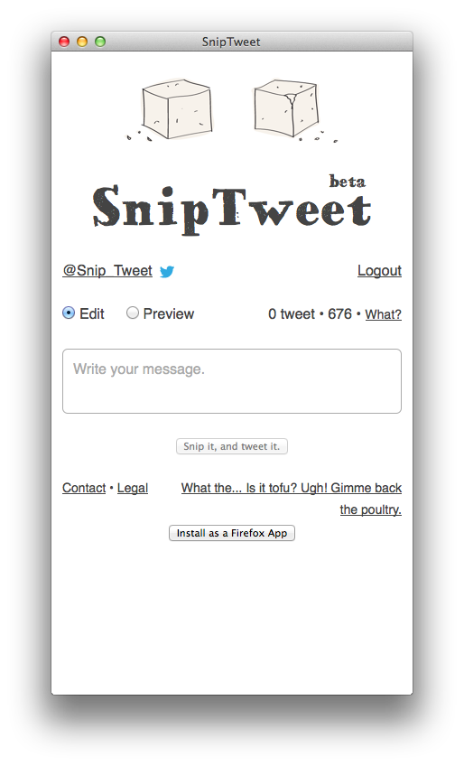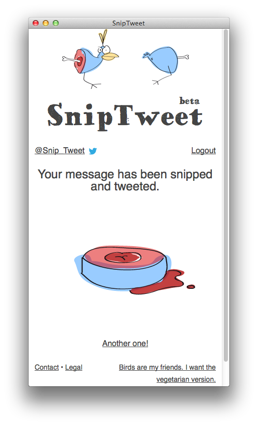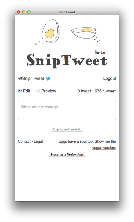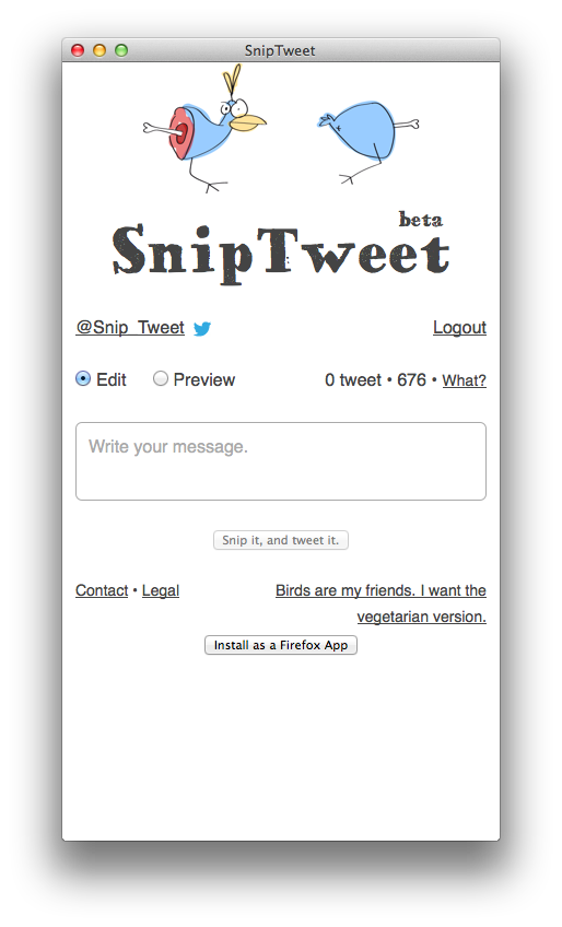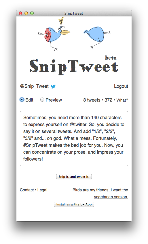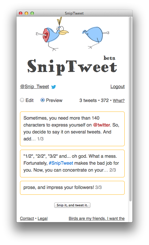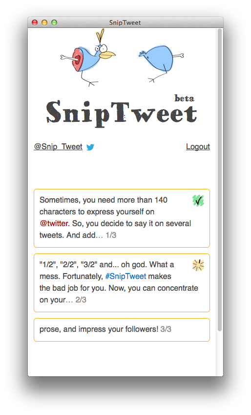 Splits your longer-than-140-characters messages into several brilliant tweets! • Cuts automatically between words • Adds counter ("… n/x") to each snipped tweet • Adds the mentions you want to each tweet • Up to 5 tweets (676 characters) to deliver your long messages, sent in a few seconds • Choose your own cæsura • Official secured Twitter's "Sign-in with Twitter" authentication • Vegetarian and vegan versions. Yes, we did it ;-) • New features to come.