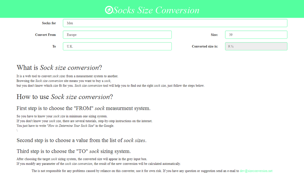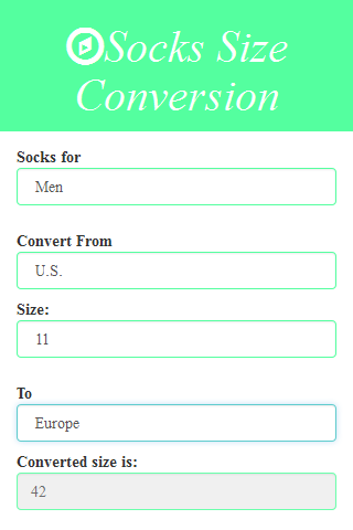 Socks Size Conversion is a web tool to convert socks sizes between different sizing systems. It is very user friendly, just modify the converter's parameters and the conversion is executed instantly