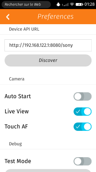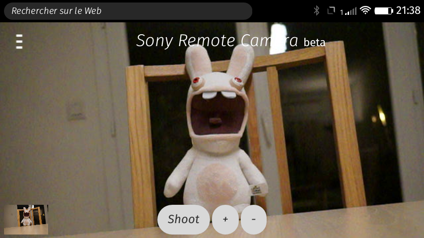 Sony Camera - Camera Remote API by Sony This application enables you to control your Sony camera wirelessly from your smartphone. See demo on youtube Usage To use this application you must start the "Smart Remote Control" application on your camera then connect your smartphone via Wi-Fi to the camera which acts as an access point. Once the Wi-Fi setup is done, you could start the Sony Camera application on your smartphone. The startup sequence will automatically initialize the record mode and the live view. You may have to setup the endpoint URL of the API in the application. Firefox OS doesn't support (yet) UDP nor SSDP (Simple Service Discovery Protocol) to discover the camera. Features The application contains the following features: