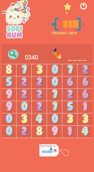 Sopinum es un juego educativo para la busqueda de numeros, que le ayudara a los mas chicos a aprender numeros de mayor complejidad, mediante su busqueda en una grilla. Con diferentes dificultades, definidas por el tamaño de la grilla y la cantidad de cifras del numero, los niños se divertiran aprendiendo! Diseñada para niños a partir de 3 años, sus divertidos personajes los acompañaran en su aprendizaje. Se equivocaron al marcar un numero? No importa! Sopinum permite jugar hasta encontrar el correcto y le da un puntaje a cada acierto. El que junta la mayor cantidad de estrellas gana!